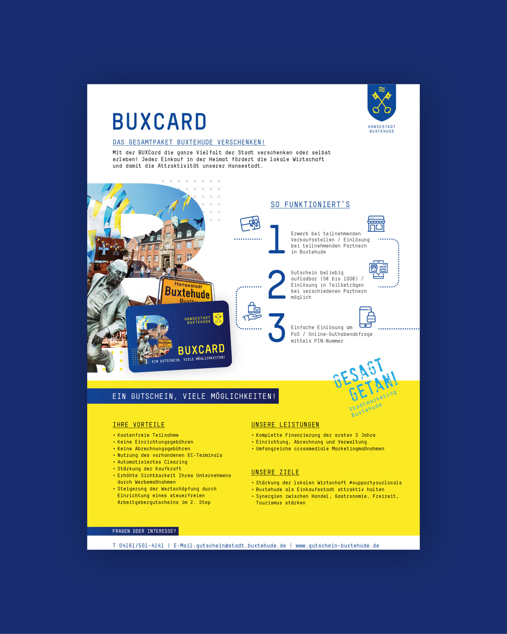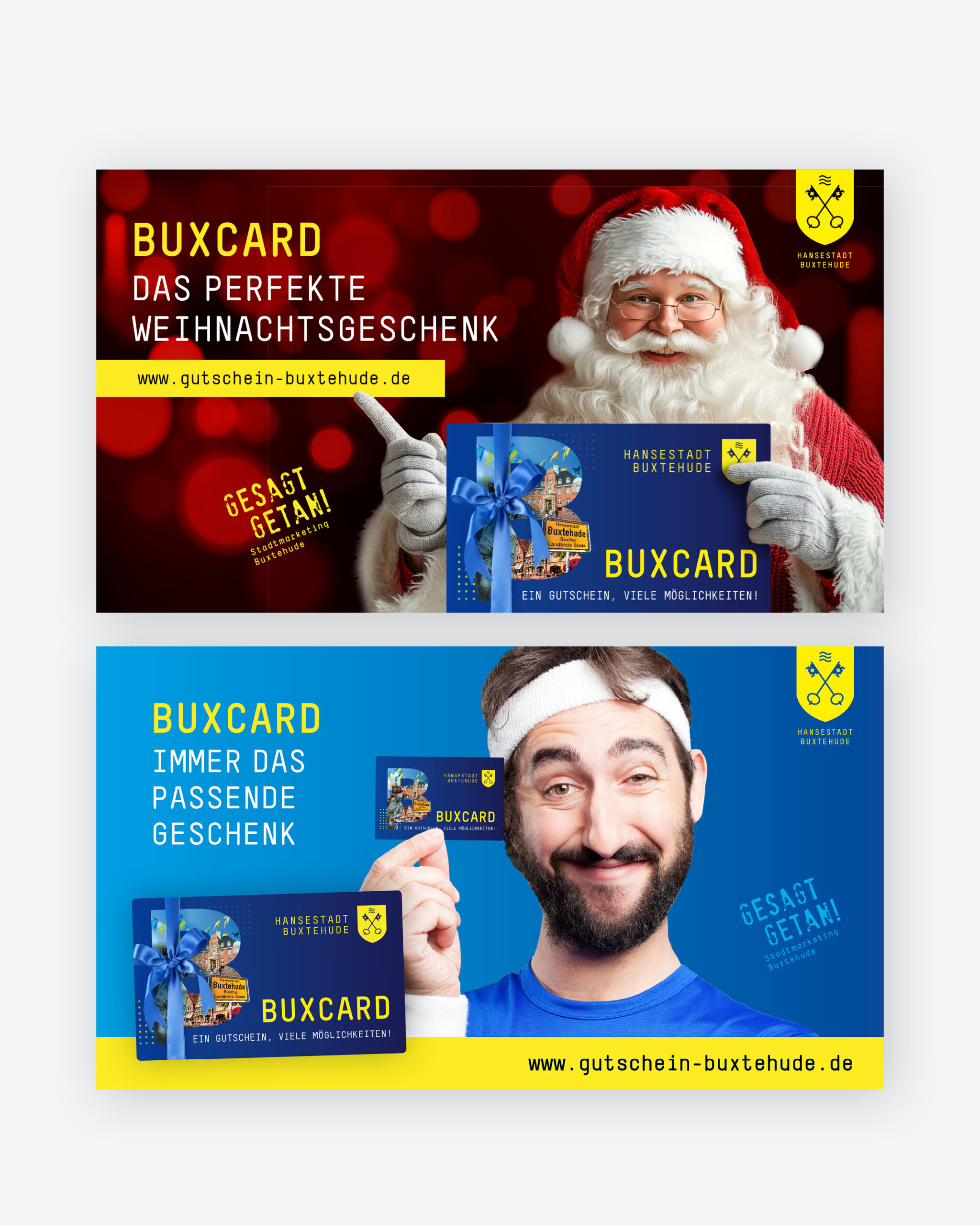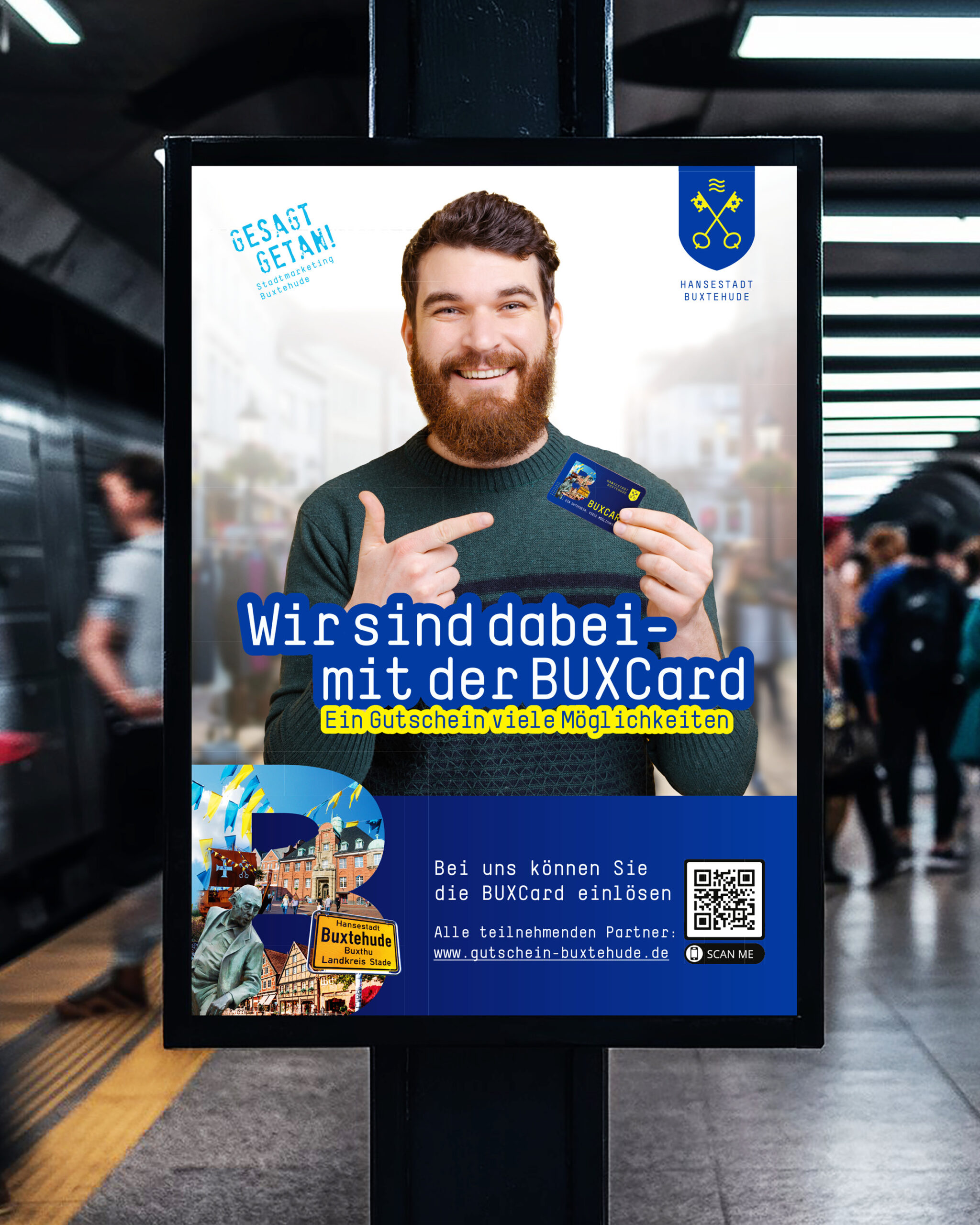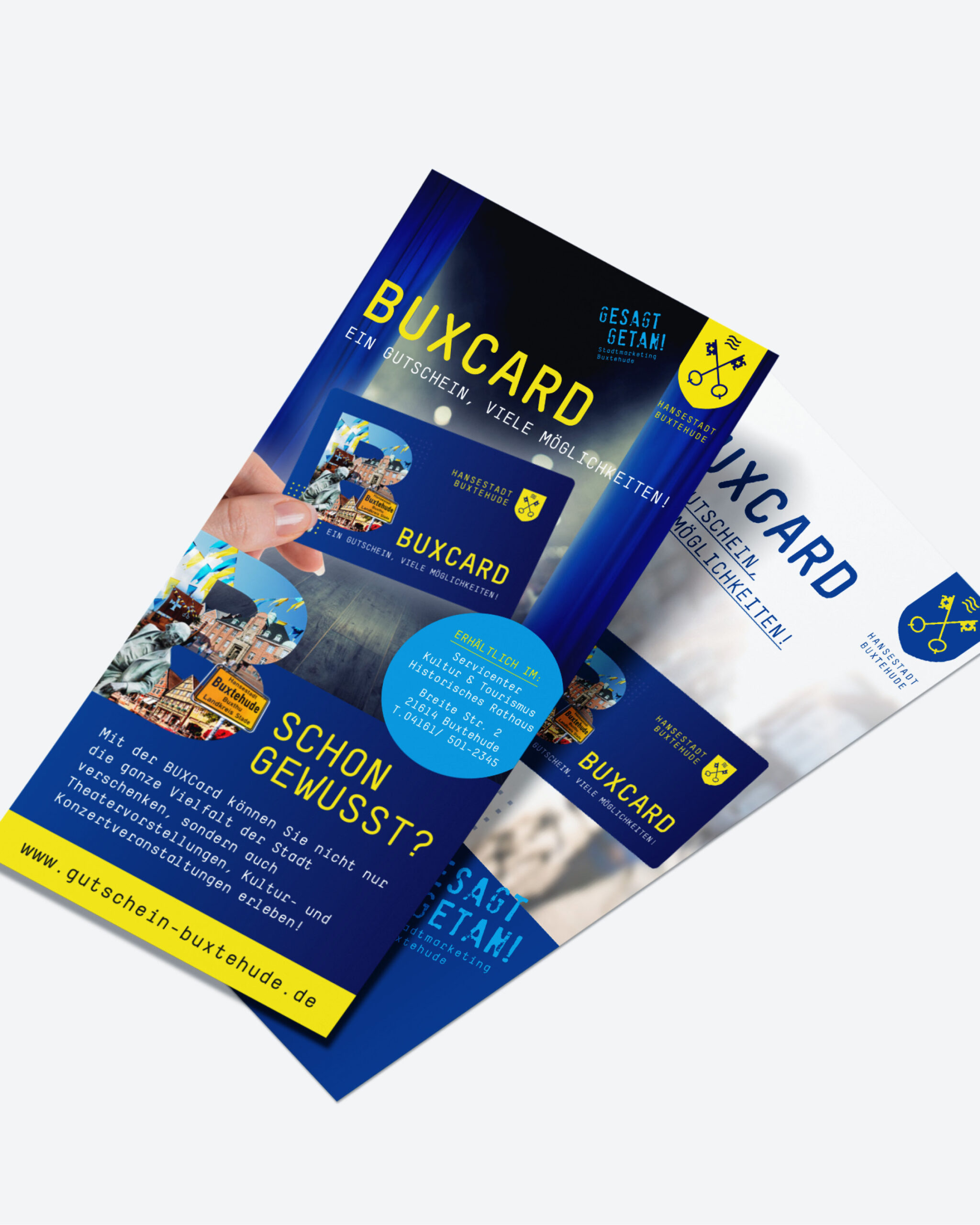 Für die Hansestadt Buxtehude sind im Laufe der Zusammenarbeit zahlreiche Printprodukte, Werbematerialien und crossmediale Kampagnen entstanden. Im Fokus stand dabei vor allem die Entwicklung und Kommunikation der BUXCard – einer Gutscheinlösung, die die Vielfalt der gesamten Stadt erlebbar macht.
